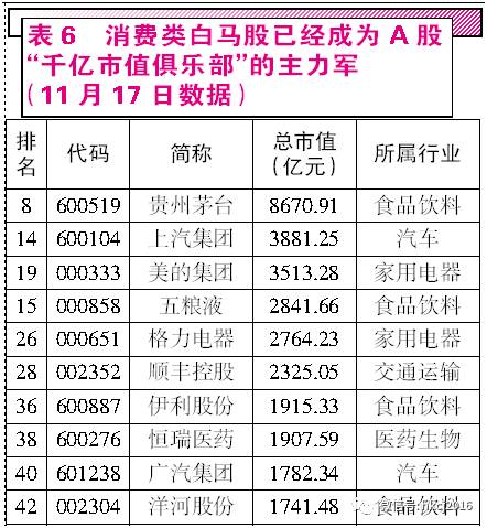 A股“千亿市值俱乐部”共有19家消费类上市公司,从今年的市场走势来看,消费类大市值白马股表现格外亮眼,其中涉及食品饮料、汽车、家用电器、生物医药等6大类行业(见表6)。
