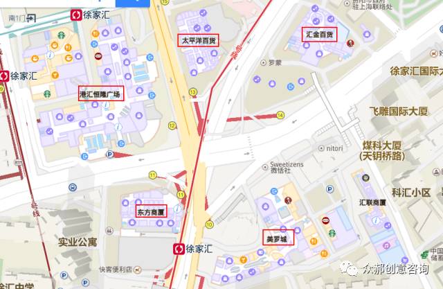 其实这样一个十字交叉路口,多家商场一起竞争的情况并不少见。十几年前,惯用电商购物的年轻人们也许不会知道,徐家汇太平洋百货曾经是了不起的商场,但紧接着在这条路上十字交叉路口,美罗城、港汇、汇金、东方商厦商场的入驻,加剧商场之间的竞争,更加剧餐饮行业的竞争。
