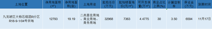 在供应的3宗地块中,两江新区鱼嘴组团P分区P6-2/01号宗地最终被终止挂牌,巴南区李家沱组团G分区G25-1/03、G26-1/03、G2-1/04号宗地被华远地产拍下,今日开拍的九龙坡区大杨石组团R分区R18-9-1/04号宗地可能是11月拍卖的最后一宗商住地块。
