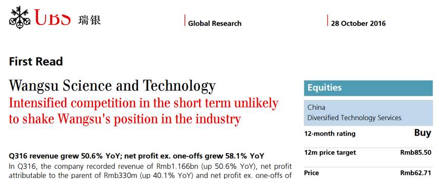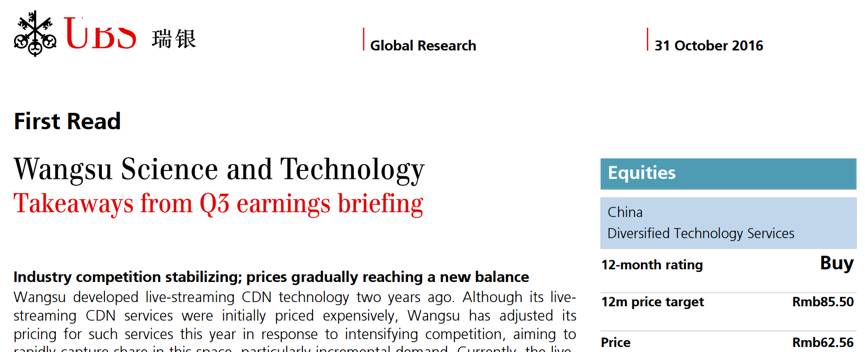 2016年10月28日和10月31日,瑞银连发两篇研报号召股民买入,认为短期内激烈的竞争不太可能动摇网宿科技在行业中的地位,给出的目标价为85.5元,目标涨幅为36%。