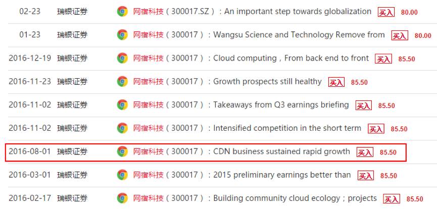 2016年7月28日(上图显示为收录时间),也就是网宿科技达到历史最高点(前复权)的当天。瑞银证券发表了一篇题为《CDN business sustained rapid growth》的研究报告,认为网宿科技业务持续高速成长,给出的目标价为85.5元。当日,网宿科技收盘价75.25元,这意味着瑞银认为网宿科技至少要上涨13%。