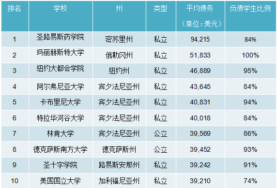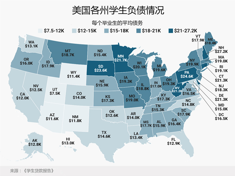 数据显示,美国大学生整体负债金额高达1.4万亿美元,平均每个学生负债17,126美元(约11.35万RMB)。最新公布的《学生贷款报告》显示,2016年美国各州大学毕业生的负债情况有很大差异,其中东北地区毕业生的平均债务普遍偏高,而西南地区负债最少。