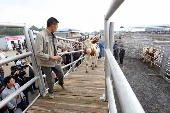 恒大一方面对当地土黄牛进行改良,另一方面则不惜重金从内蒙古、吉林等牧区引调优质基础母牛供贫困户饲养,还从澳大利亚引进优质种牛帮助大方县实现肉牛养殖产业升级。去年9月21日,“恒大集团结对帮扶大方县首批西门塔尔牛贷款购买仪式”在凤山乡举行,半天工夫,109头西门塔尔“扶贫牛”就被凤山和三元两个乡48户贫困农户抢购一空。