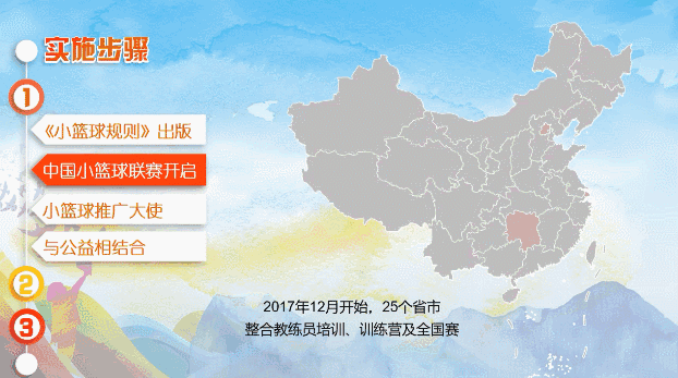 姚明在会上表示,中国篮协将以小篮球联赛为引领,以《小篮球规则》和《中国小篮球运动员等级制度》为驱动,以各级篮球协会、社会青少年篮球培训机构培训基地、全国各小学为支柱,搭建“教练员培训、技术标准、周末假期训练营、大数据”四个系统,通过政府主导、社会支持、市场助力的共同推动,促进体教结合、体社结合、体企结合、内外结合,真正把篮球运动推广到基层的少年儿童中去,成为少年儿童最喜爱的运动之一,并养成终身参加体育锻炼的习惯。据姚明透露,中国小篮球联赛将从12月份开打,陆续在25个省市开展,同时结合赛事开展教练员培训、训练营等项目,打造专属中国少年儿童的赛事IP。