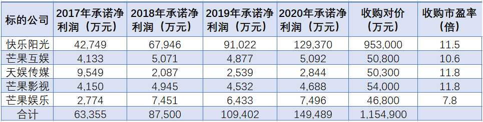 在此次的收购中,五家收购标的均对2017-2020年作出了四年的业绩承诺。其中,快乐阳光称四年的净利润分别将达到4.27亿元、6.79亿元、9.1亿元、12.93亿元。五家合计四年净利润分别达到了6.33亿元、8.75亿元、10.94亿元以及14.98亿元。按照四年的平均净利润计算,收购标的的市盈率分别为11.5倍、10.6倍、11.8倍、11.8倍以及7.8倍。