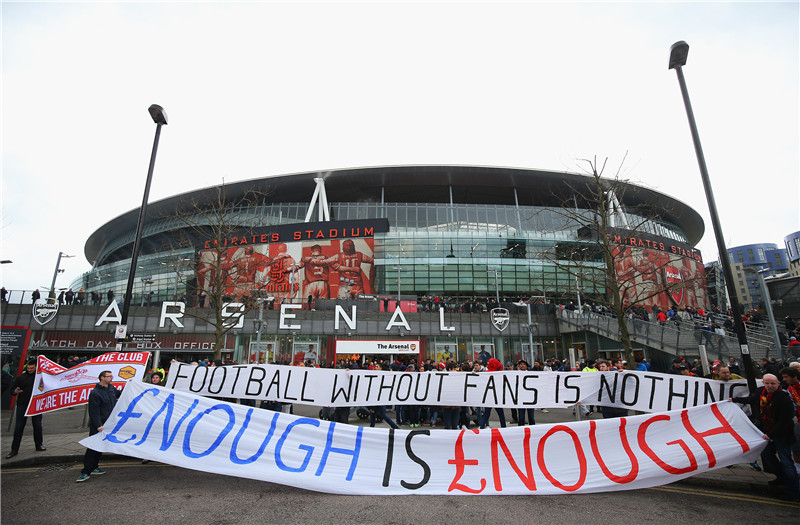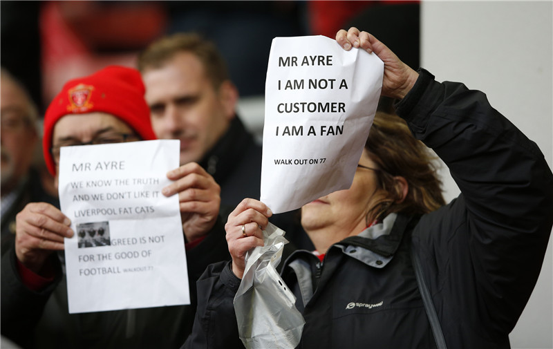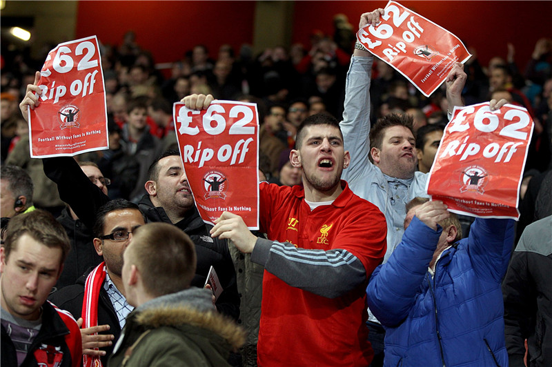过去两年,这些英超拥趸也在多个场合向自家俱乐部表达了不满。2016年2月,在利物浦主场2-2战平桑德兰的比赛中,大批球迷于全场第77分钟离开安菲尔德球场,以此抗俱乐部在下赛季将主看台最高等级门票从59镑涨至77镑的提议。