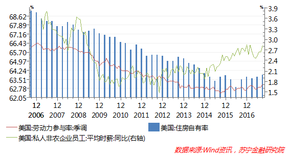 第一,劳动力市场改善提振了美国房地产市场的需求,新千禧一代成为住房需求的生力军。美国劳动力市场改善表现在三个方面:9月份美国失业率为4.2%,创下十年来新低;美国劳动参与率回升到63.1%;美国私营企业时薪同比涨幅达2.5%,环比连续31个月保持正增长,稳步回升趋势确立。失业率下降和工资水平的上升,为购房需求提供了强劲动力。