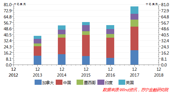 而且,海外买家的房产均价53.69万美元,接近美国整体房产均价27.77万美元的两倍。其中,中国买家在美购房金额,远在加拿大、印度、墨西哥和英国买家之上,位居美国房产海外买家第一宝座(参见下图),且美联储加息政策对于海外买家的影响并不大。