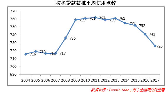 然而,不可否认的趋势是,最近两年商业银行为了抢占房贷市场份额,放松信贷要求和门槛的倾向有所加剧。美国两大住房金融机构之一房利美的数据显示,2017年三季度末,按揭贷款获批的平均信用点数已降至726,与金融危机前2004-2007年的差距越来越小(参见下图)。