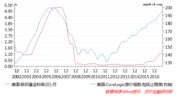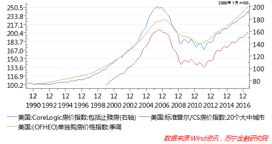 大多数市场分析机构都使用OFHEO(联邦住房监督办公室)指数、 Corelogic 房价指数和标准普尔20大中城市房价指数来反映美国房价的整体波动。从三个指数波动看,2006年下半年,美国三大房价指数均达到前期高点,随着美联储收紧货币政策,美国房价进入下行通道,次贷危机持续发酵,最终引爆了2008年国际金融危机。