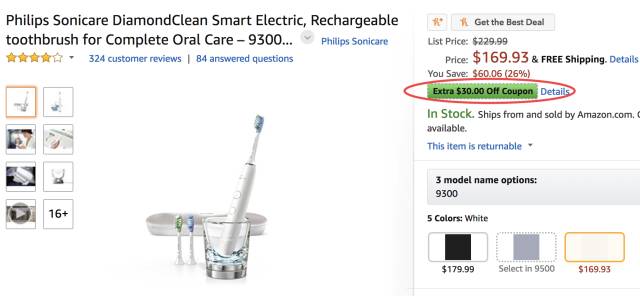 Philips Sonicare DiamondClean (HX9903/21)智能蓝牙电动牙刷,现价$138.95,立省$91.04,需点击 '$30 Off Copuon' 激活优惠劵。