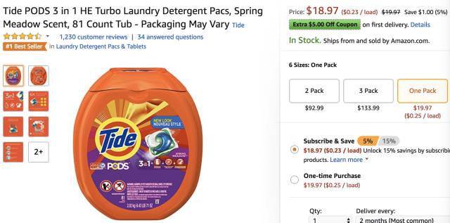 Tide PODS 汰渍三效合一果冻洗衣球81个,现价$13.23,需要点击激活$5 off 优惠券和subscribe&save结账
