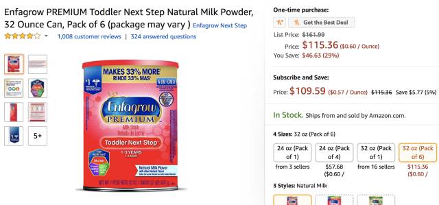 美赞臣Enfagrow PREMIUM婴幼儿三段配方奶粉 32oz 6罐装,用subscribe&save结账$109.59,立省$52.4