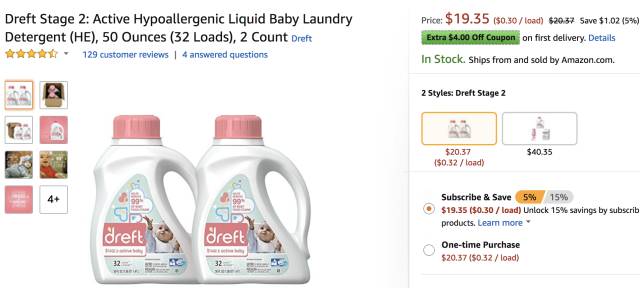 Dreft宝宝洗衣液,1.47L 2瓶 ,现价$15.35,需点击$4优惠券用Subscribe &Save结账,立省$4