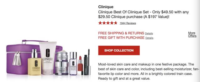 倩碧换购,倩碧任意订单满$29.50或以上,即可加$49.50换购价值$197的套装。套装包括:正装黄油,泡沫洁面,防晒,Smart系列晚霜,Tkae the day off紫瓶眼唇卸妆液,Pop小方唇膏,睫毛膏,精美化妆包。