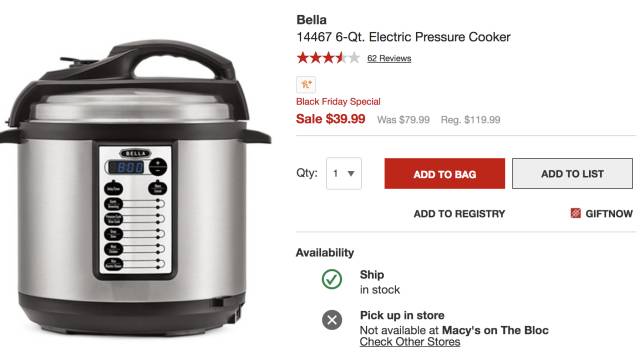 Bella 6夸脱电压力锅,10档预设煮食程序,触控面板可预约, 现价$39.99,立省$80