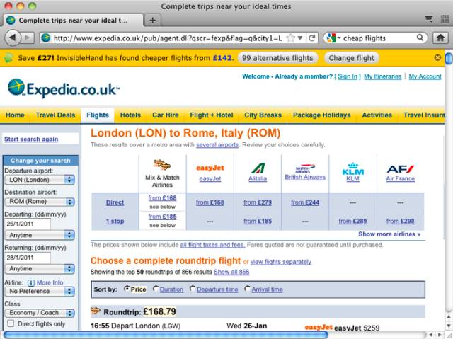 InvisibleHand主要用于比较购物、机票、酒店和汽车租赁价格。当你安装之后,打开浏览器浏览产品时,InvisibleHand会自动显示比价。