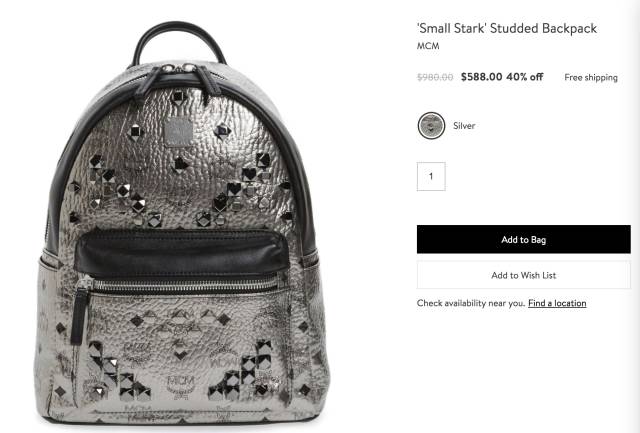 MCM小号银色铆钉双肩包,现价$588,立省$392