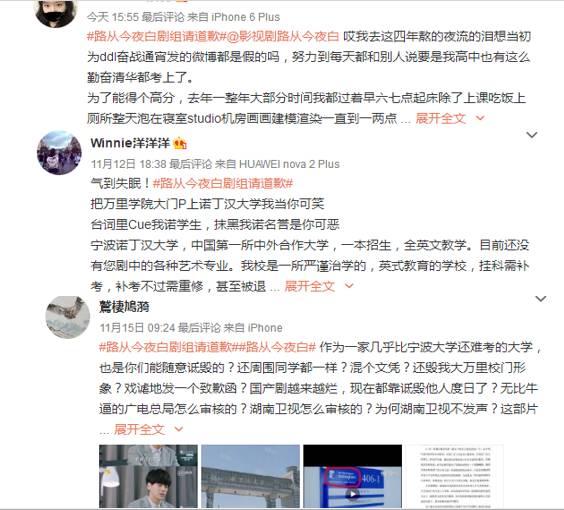 虽然影视剧可以虚构情节,但是在剧中引用学舍真名,甚至还说出“混文凭”这样的台词,确实是十分不妥。更何况,诺丁汉大学在《路从今夜白》剧组拍摄时还供给了很多赞助。于是,该集一经播出,“路从今夜白剧组请报歉”的话题也在微博持续发酵,越来越多的诺丁汉学生参加到声讨浪潮中。