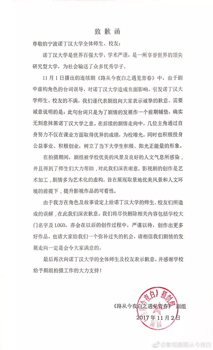 随着微博道歉声讨的态势愈发强烈,《路从今夜白》剧组很快就采取行动,当天下午通过官方微博发表了致歉信,信中表达了对诺丁汉大学造成的负面影响表示诚挚的歉意。