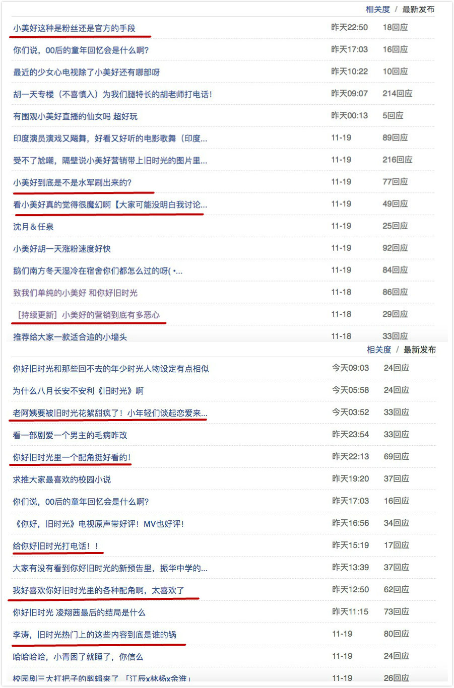 关于这种现象,有“旧时光”的粉丝在豆瓣发帖称认为这是自家剧没有钱做营销,被竞品“小美好”捆绑营销的缘故。不过,两家剧集的官微在微博上体量悬殊:“小美好”是47万,“旧时光”粉丝是8万。看起来似乎前者并没有捆绑营销的动机。
