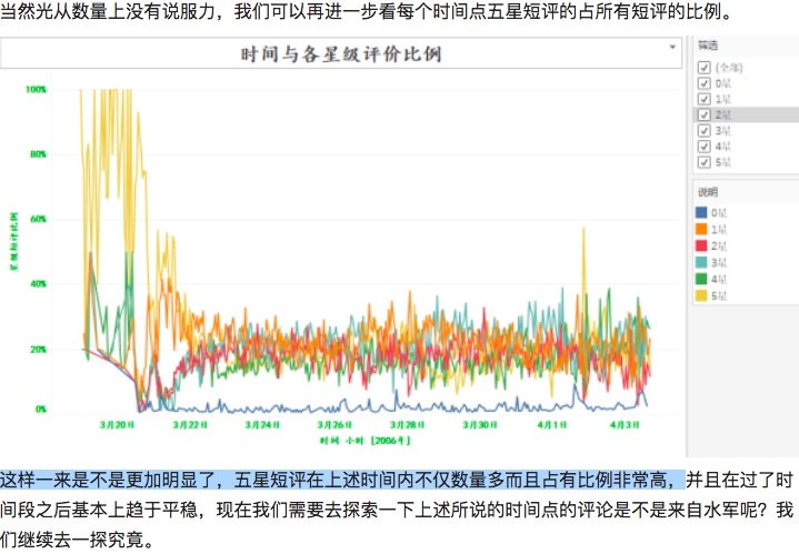 知乎用户路人甲曾在今年早些时候对评分突升至8.1分的《西游伏妖篇》进行了数据分析,对其36409条有效评论和相关ID、时间、内容进行了抓取和进一步研究,发现存在五星短评的集中时间点,并且在短时间内高度重复了一些赞美性的词语。“结论已经得出:显然,豆瓣的这部电影还有不少的水军在,豆瓣并没有清理干净。”