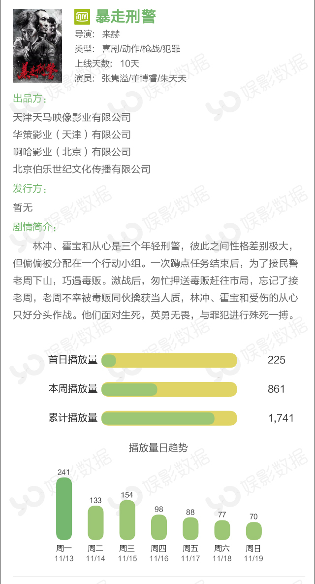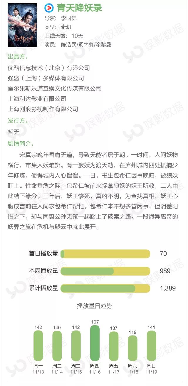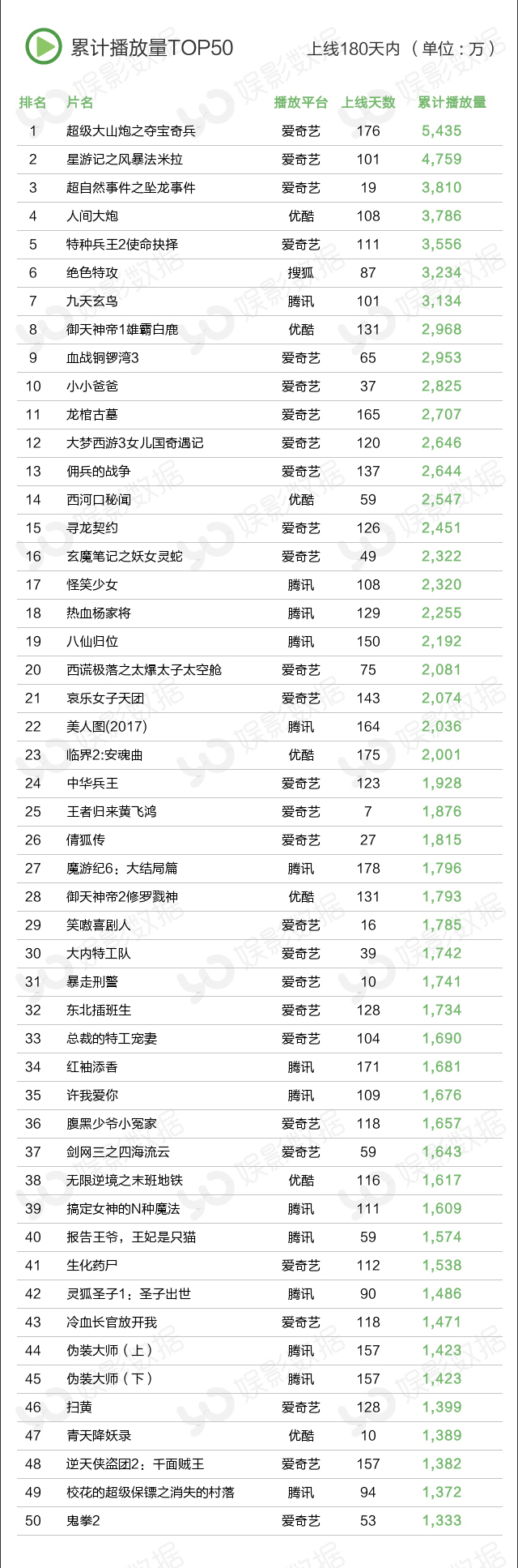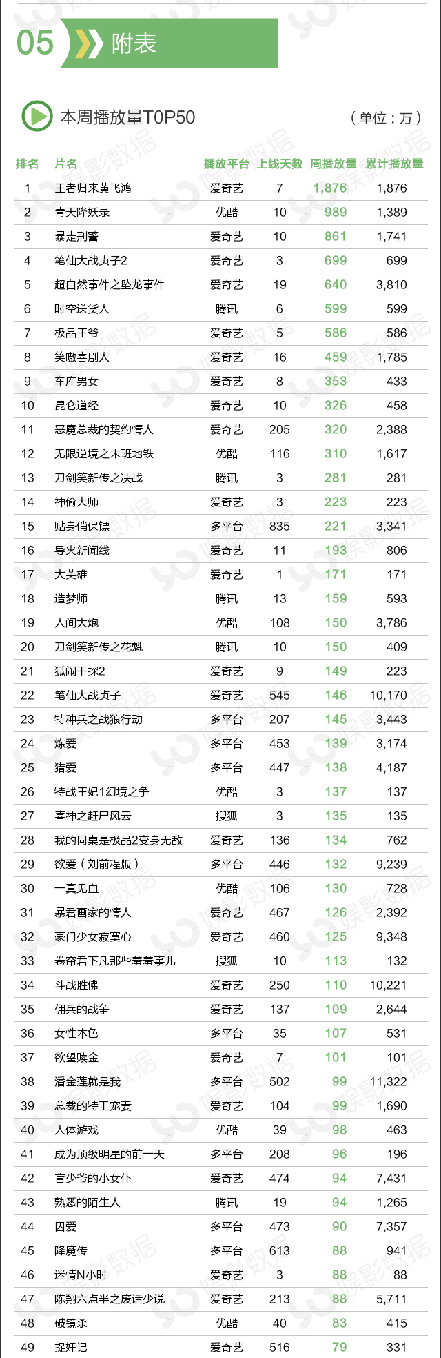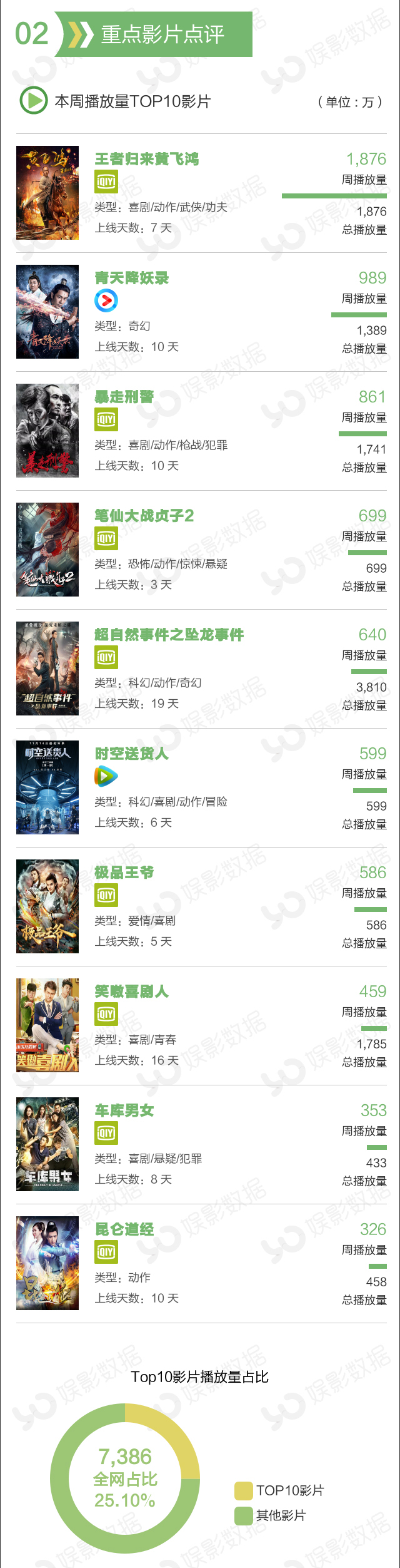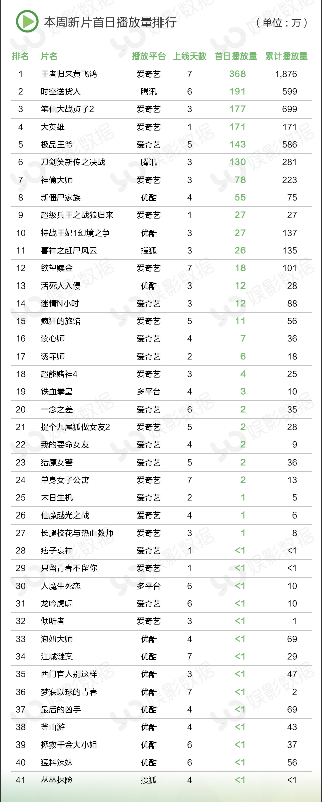 本周的新片整体表现一般,播放量前10榜单中有四部新片。但本周的前三影片表现抢眼,分别是:在爱奇艺上线7天的喜剧动作片《王者归来黄飞鸿》;在优酷上线10天的奇幻片《青天降妖录》;喜剧混搭动作、犯罪的影片《暴走刑警》本周蝉联第三。