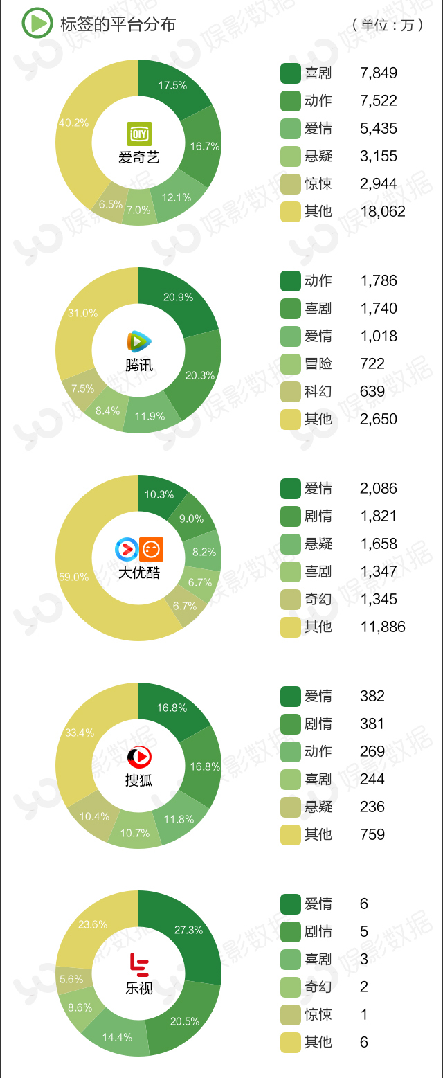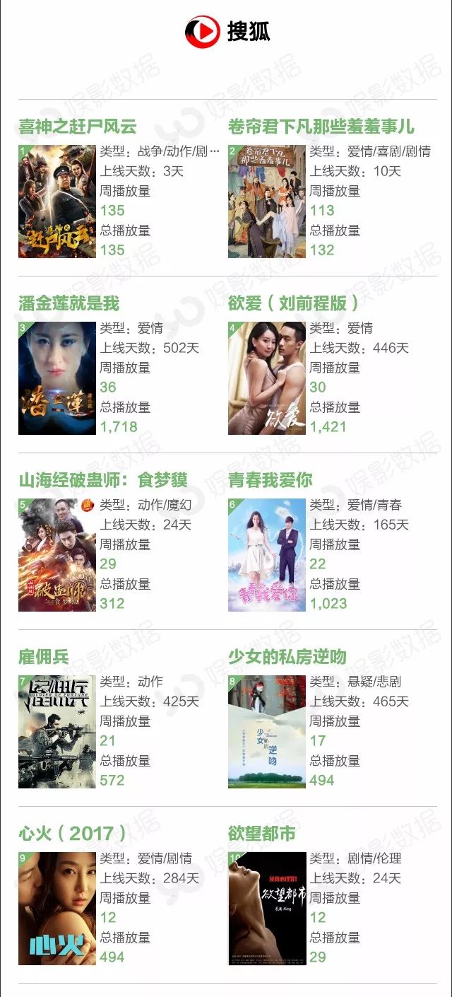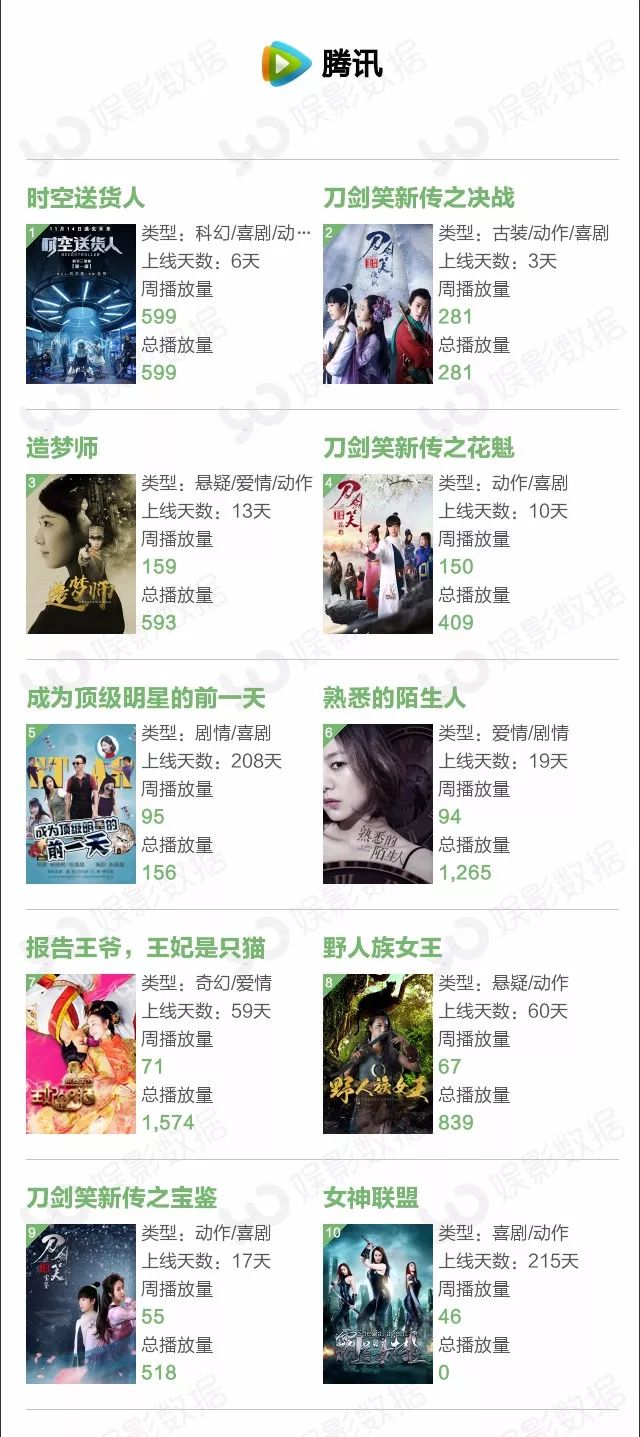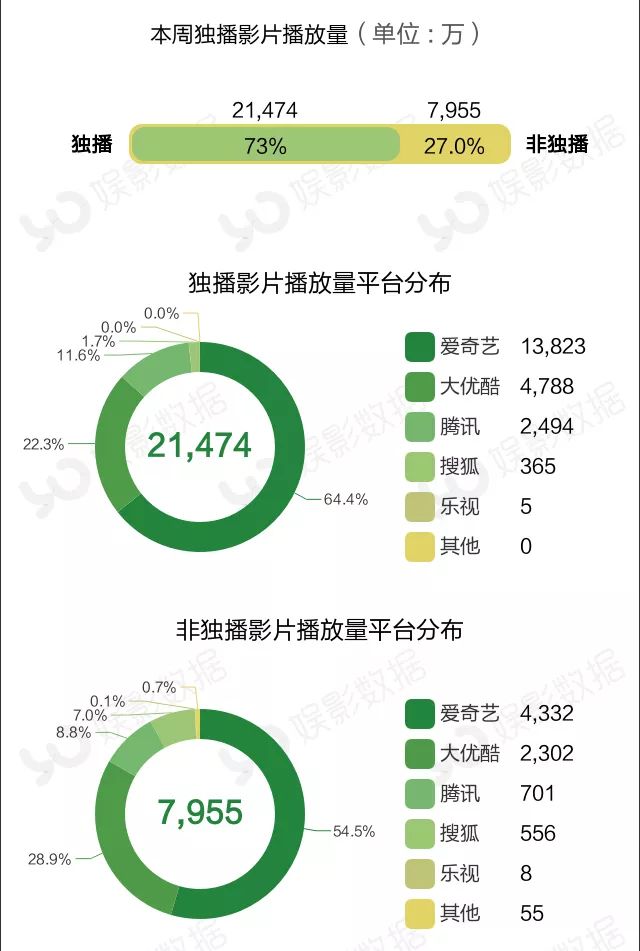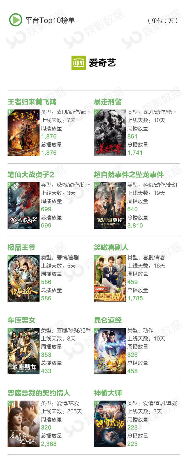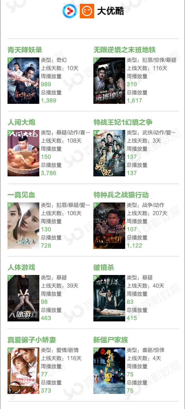 本周排名前十的网大,有8部是在爱奇艺独播,腾讯1部、优酷1部,乐视、搜狐皆没有影片进入前十。