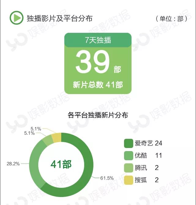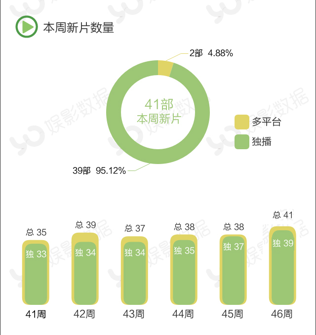 本周上新影片数量41部,比上周增加三部;其中独播片39部,仍占绝对主流。