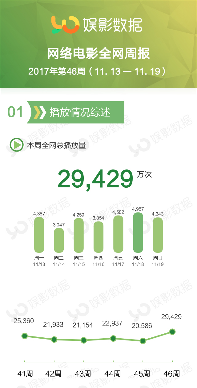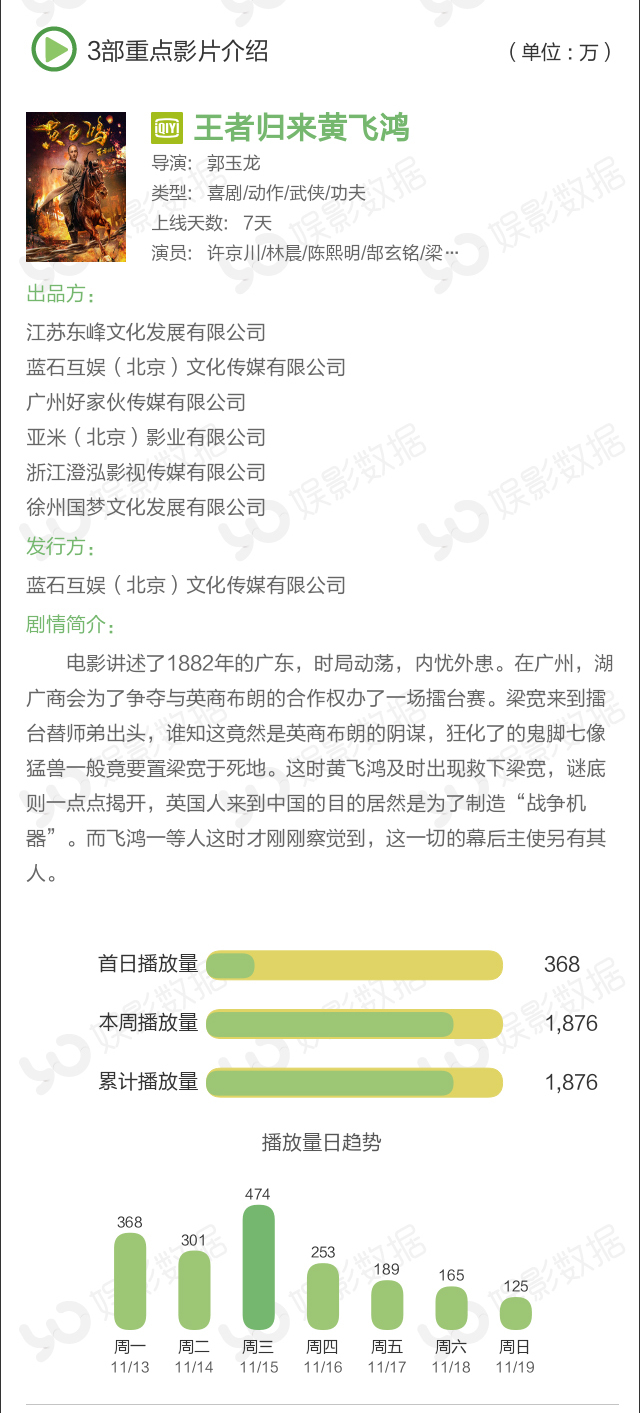 娱影数据显示,2017年第46周(11月13日至11月19日),网络电影全网播放量为2.94亿次,较上周上升43.0%。其中周六(11月18日)最高,达4957万。本周获得冠军影片是在爱奇艺上线7天的《王者归来黄飞鸿》,获得1876万次播放量,为本周网络电影播放量注入新鲜力量。