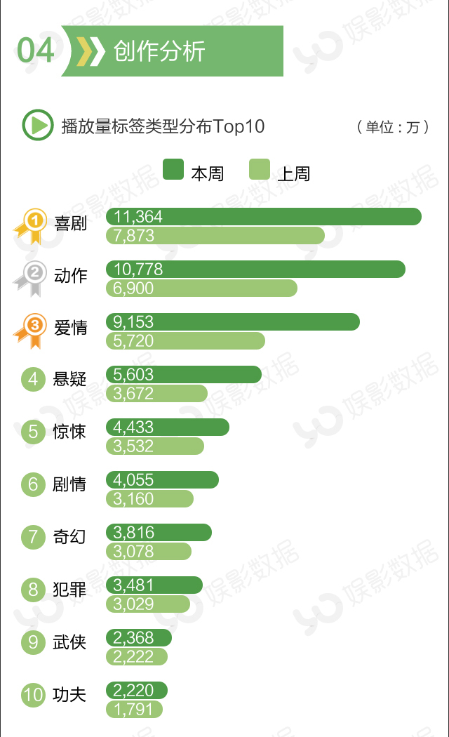 本周观众最喜欢的类型片前三稍有变化,分别是喜剧、动作、爱情。悬疑片由上周第五升至本周第四名,惊悚片由上周第八升至本周第五位,奇幻片从连续三周的第四名将至本周第七名。本周头部影片《王者归来黄飞鸿》还带动了武侠、功夫类型标签,本周分别排在第九、十名。