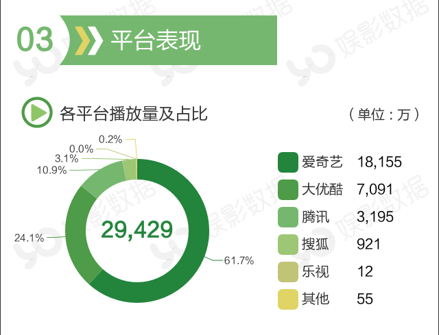 本周平台表现方面,排名与上周稍有变化。爱奇艺仍排名第一,占比61.7%,较上周下降5.7%;大优酷本周排名第二占比24.1%,较上周上升10.2%;腾讯本周排名第三,比上周下降一位,占比10.9%,下降4.5%;搜狐与乐视分别名列第四、第五。