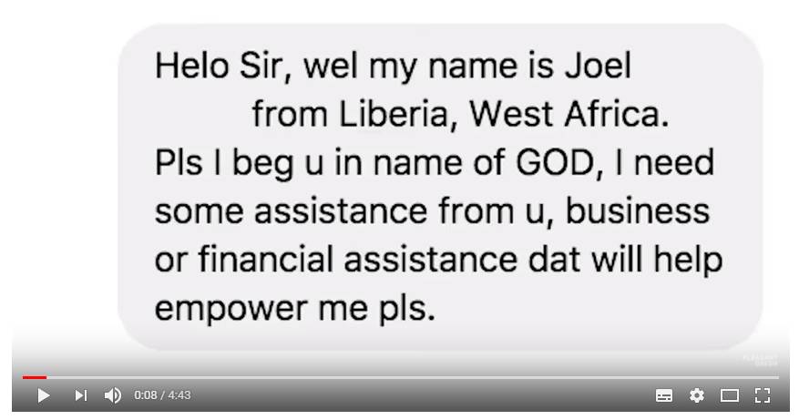 Youtube博主“Pleasant Green”在自己的频道分享影片,讲述这段令人暖心的经历。加拿大乐活网(lahoo.ca)了解到,几个月前他在脸书上被一名来自非洲利比亚的男子找上,这名叫做Joel的男子给Pleasant Green发送的信息写到,“先生你好,我的名字叫Joel,我来自西非的利比里亚。我以上帝的名义恳请你,我需要您的帮助,无论是生意上还是经济上的帮助都行,请帮助我。”