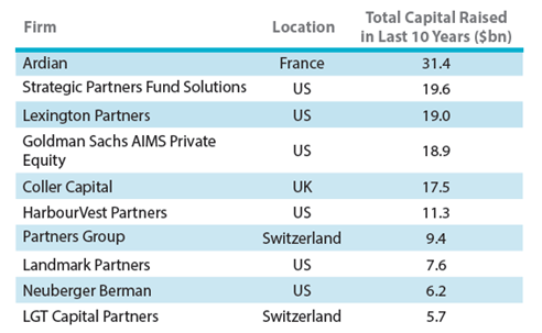 图表一:全球前十大PE二级市场基金管理公司过去十年的募资总额
