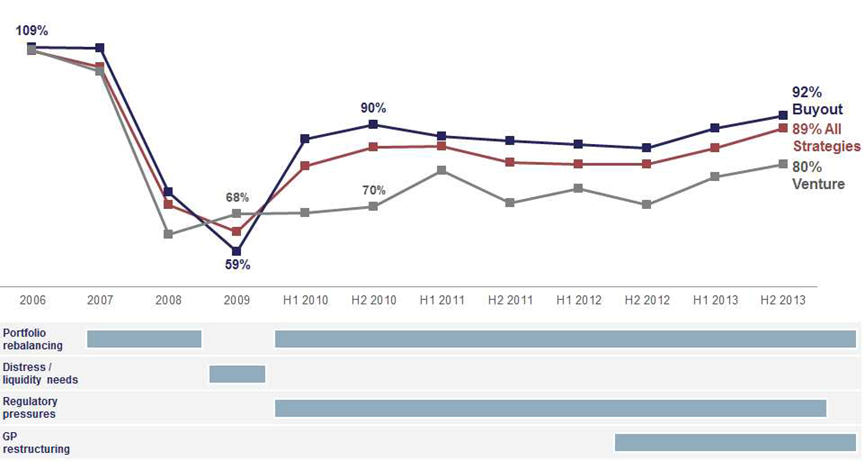 第四种是使用尾部交易和结构性交易:普通的LP位置在投资组合的销售中是非常有竞争力的。而基金周期的延长,以及GP引导的重组(从提供新鲜的资本到实现一个现有基金的偏好回报,再到完全转移一个基金余下的资金到一个新的基金结构中,同时买断现有投资者的仓位)是缺乏竞争力的。然而,如果能够利用好后者的机会,回报一般更高。当然这要求买家拥有这个投资组合内部信息,与私募基金管理者的良好关系,高的谈判和结构性的技巧。