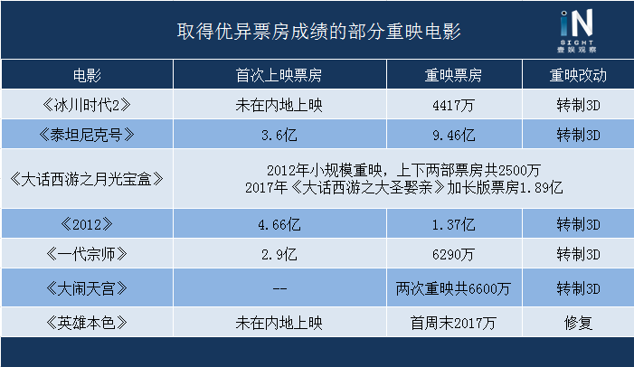 这两年来,不少重映电影都取得了不错的票房成绩,今年上半年由影联传媒发行的重映影片《大话西游之大圣娶亲》就取得了1.89亿的华语电影重映最高票房,再往前的3D版《泰坦尼克号》,2012年重映时在中国取得了将近10亿的票房。