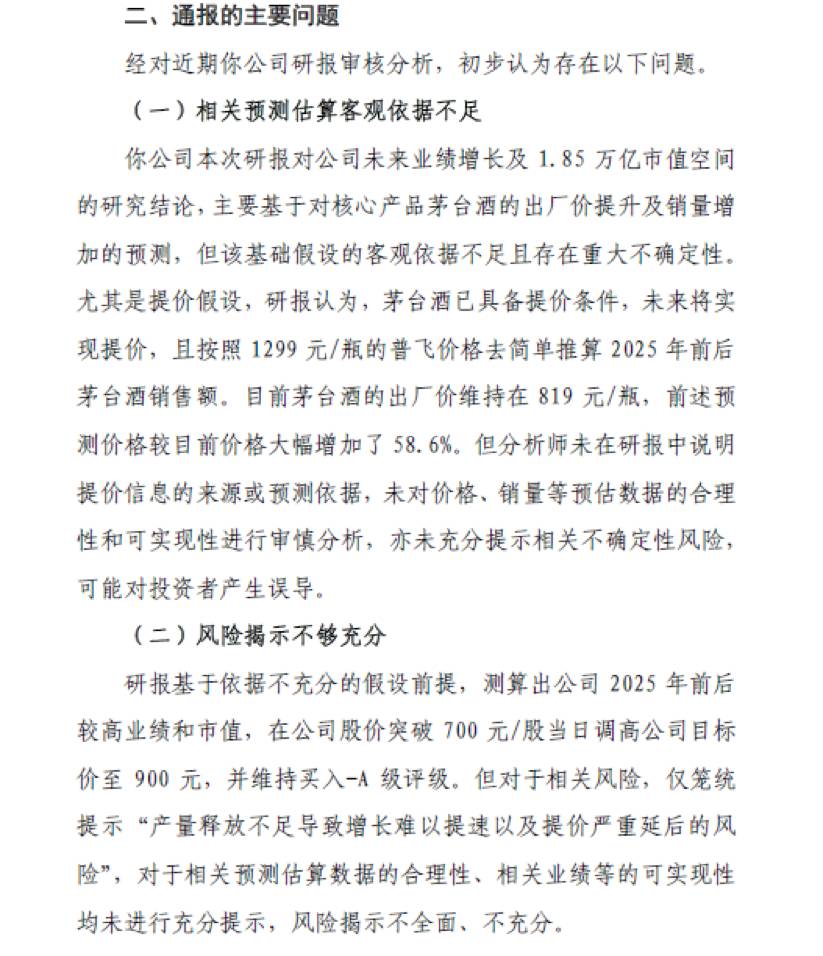 根据媒体的公开报道,11月20日晚间,上交所发布《关于安信证券发布贵州茅台研究报告相关事项的通报函》,通报称经对近期安信证券研报审核分析,分析师未在研报中说明提价信息的来源或预测依据,未对价格、销量等预估数据的合理性和可实现性进行审慎分析,亦未充分提示相关不确定性风险,可能对投资者产生误导。