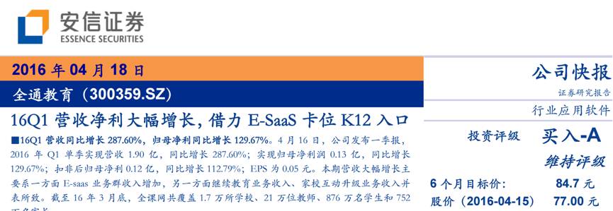 2016年4月18日,安信证券发布研究报告,给予全通教育“买入-A”评级,目标价84.7元,目标涨幅10%。