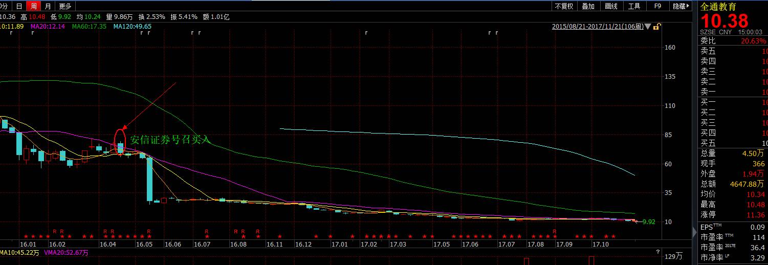 安信证券发布研报号召买入当日至今,全通教育复权股价跌幅达到66%,如果投资者在安信证券研报发布当日,以平均成交价买入,持有到现在,差不多相当于吃了10个跌停板!