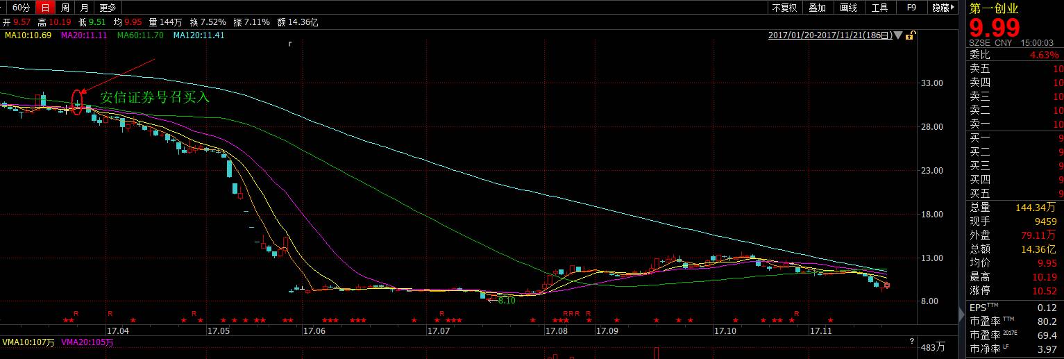 除了全通教育,安信证券还曾力荐过昔日市值近千亿的券商股第一创业(00279.SZ),可惜又是在股价狂泻之前。