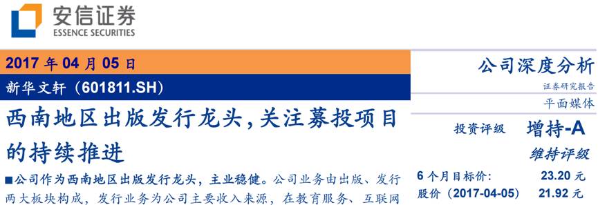 2017年4月5日,安信证券发布题为《西南地区出版发行龙头,关注募投项目的持续推进》的研究报告,给予新华文轩“增持-A”评级,目标价23.2元,目标涨幅6%。