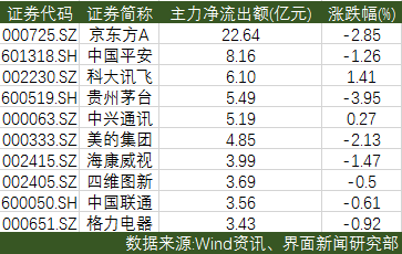前期涨幅较大的多只热门个股纷纷出现回调。中国平安(601318.SH)、贵州茅台(600519.SH)两只“明星股”首当其冲,分别净流出8.16亿元、5.49亿元。其中,贵州茅台股价下跌3.95%,报650.52元/股。京东方A(000725.SZ)股价下挫2.85%,逾22.64亿元主力资金集中出逃。市值突破1000亿元、股价创下新高的科大讯飞(002230.SZ)遭遇主力资金持续抛售,今日净流出6.10亿元。