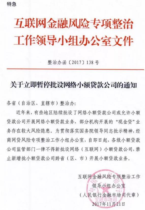 11月22日,一条重磅消息传来,互联网金融风险专项整治工作领导小组下发了特急文件,要求立即暂停批设网络小贷公司。多位业内人士解读,这次叫停直接针对的是目前备受争议的现金贷业务。