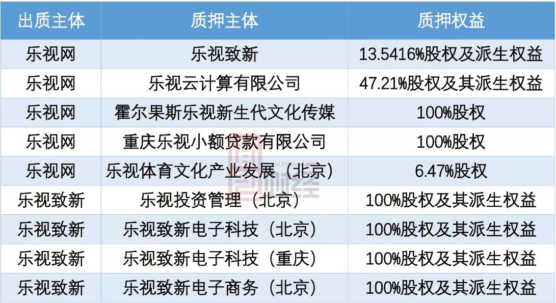 该笔借款中,一共涉及乐视网子公司及乐视致新子公司在内的9家公司的股权质押: