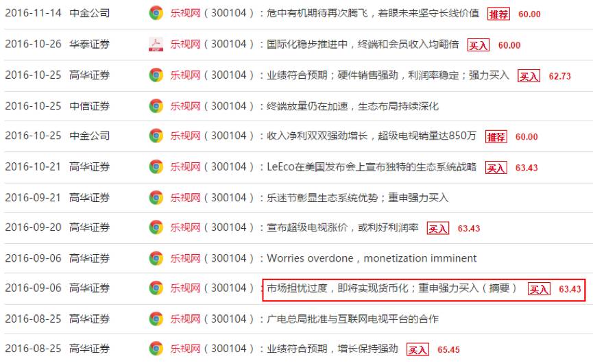 例如,2016年9月6号,高华证券发表了题为《市场担忧过度,即将实现货币化;重申强力买入》的研究报告,给出的目标价为63.43元,目标涨幅40%。
