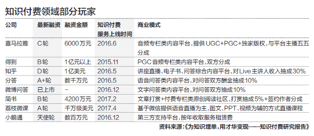 2017年初,知识付费延续了去年的火热。4月,喜马拉雅FM发布了马东和《好好说话》原班人马打造的付费音频节目《小学问》;5月,蜻蜓FM发布了联手高晓松做的付费节目《矮大紧指北》;7月,分答拉来网红papi酱任职分答“不设限青年研究所”首席洞察官……