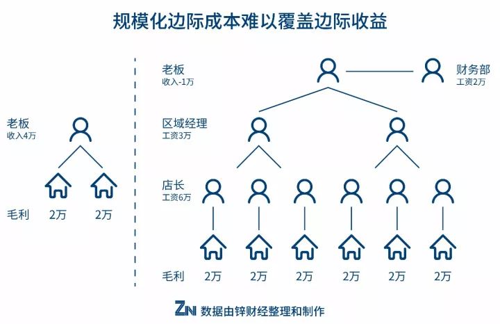 大店开连锁很多都这样,开第一家第二家的时候,每个月的毛利润可能有七八万。但门店数量上去之后,每新增一家店所付出的人工成本是巨大的。手头只有两家的时候,每个月主要支付的可能就是十几个服务员和厨师的工资,但一旦门店数量增加,就需要有后端供应链的集成以及管理人才的进入,而这些成本根本不能被额外开店的收益覆盖。