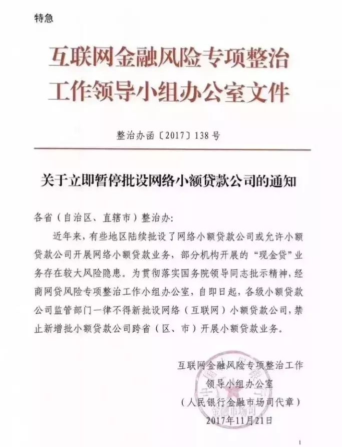 联网金融风险专项整治工作领导小组办公室向各省(自治区、直辖市)整治办下发了特急文件《关于立即暂停批设网络小额贷款公司的通知》(下文简称《通知》),要求各级小贷公司监管部门即日起一律不得新批设网络(互联网)小额贷款公司,禁止小贷公司跨区域经营。