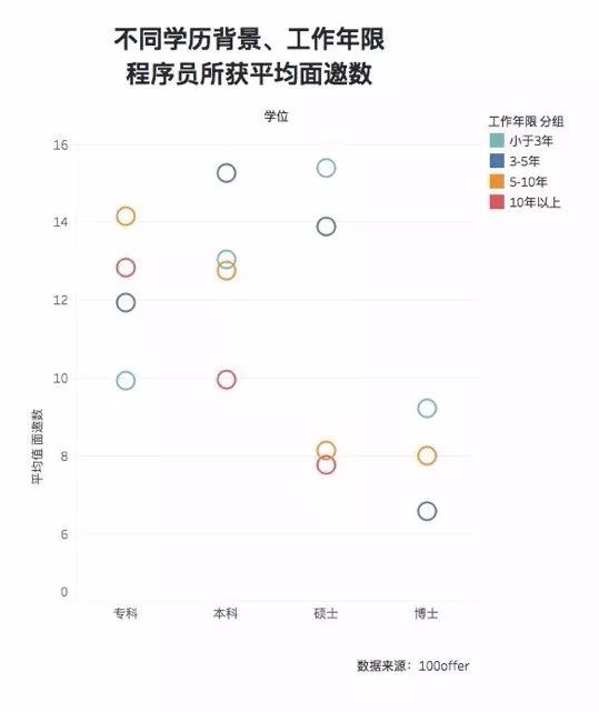 很有趣的一个现象,工作 10 年 +,专科生和本科生在平台上能够收获 10–12 封面邀,相对而言,硕士不到 8 封。
