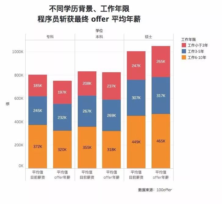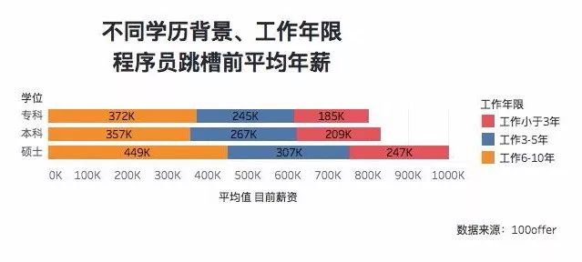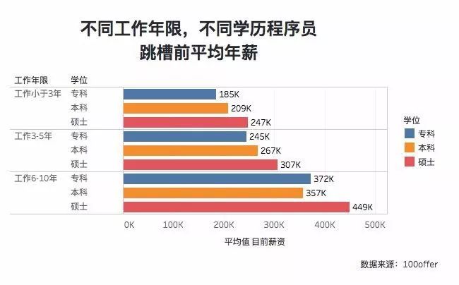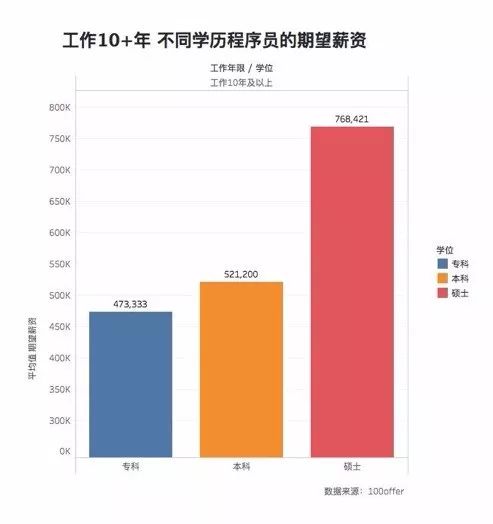 无论是工作多久的硕士程序员,年薪都比同样工作时间的本科程序员和专科程序员高出 4 万 +,工作 6-10 年的硕士生,平均年薪达到近 45 万。